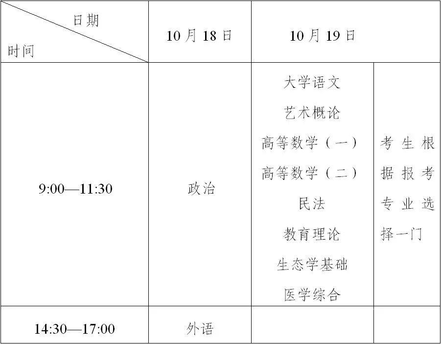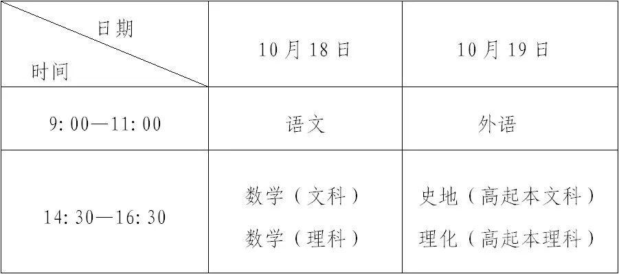 所有统考科目每科试题满分均为150分。高起本、高起专统考科目每科考试时间为120分钟,专升本每科考试时间为150分钟。具体考试时间如下: