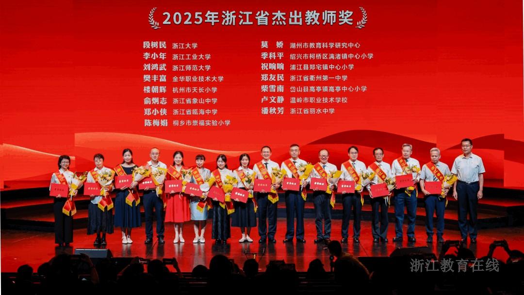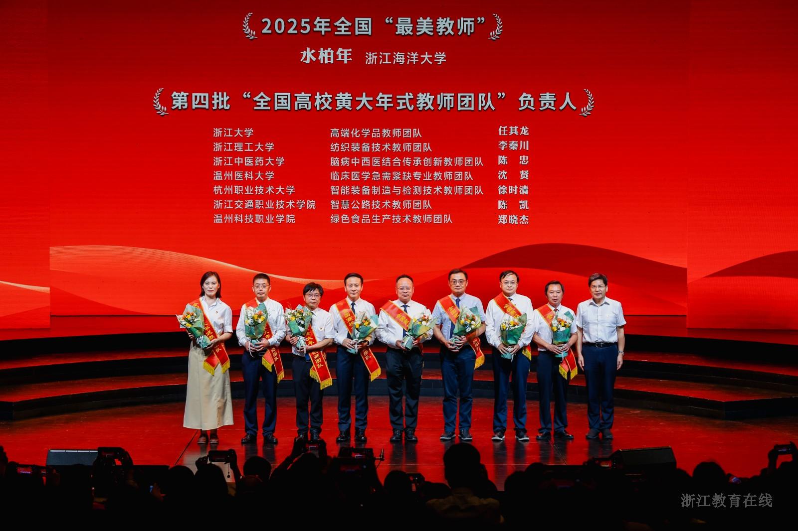活动现场还发布了入选2025年全国“最美教师”的浙江教师、入选第四批“全国高校黄大年式教师团队”的浙江教师团队负责人、2025年浙江省“最美教师”,表彰了2025年浙江省杰出教师。2025年全国“最美教师”、浙江海洋大学教授水柏年感慨:“今晚的庆祝会不仅是一场音乐会和表彰会,更是一次情感的共鸣和精神的洗礼。优美的音乐唱出了老师们的初心和传承,激励我们继续扎根讲台、潜心育人,培养更多栋梁之材。”