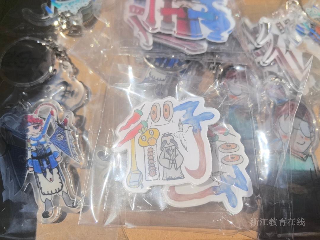 这些作品都是我们自己画的,先在纸上手绘,然后拍照发给商家,再加工成徽章、冰箱贴等文创产品。大多数作品是小组合作完成的,也有个人独立创作。