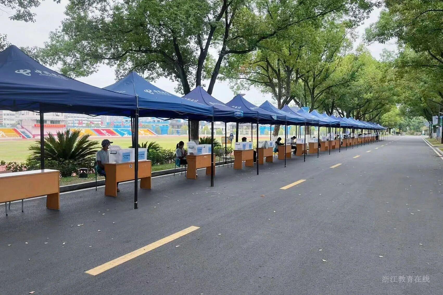 湖州、金华等地考点在物品存放区域搭设雨棚
