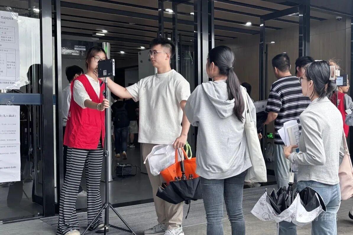 台州、嘉兴等地志愿者协助存取物品、指引考生入场