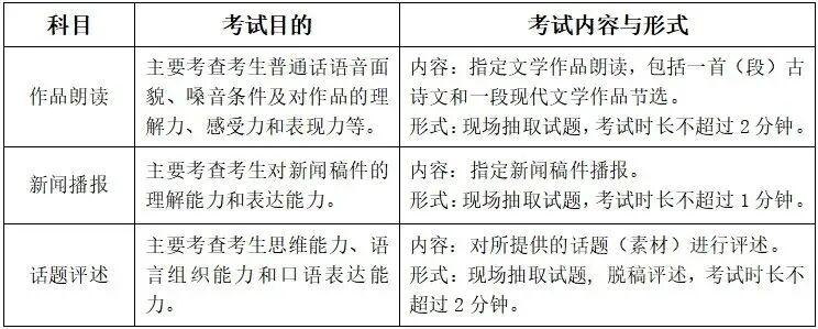 考试包括作品朗读、新闻播报、话题评述三个科目,每科各100分,总分为300分。