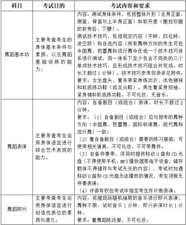 考试包括舞蹈基本功(120分)、舞蹈表演(150分)、舞蹈即兴(30分)三个科目,总分为300分。