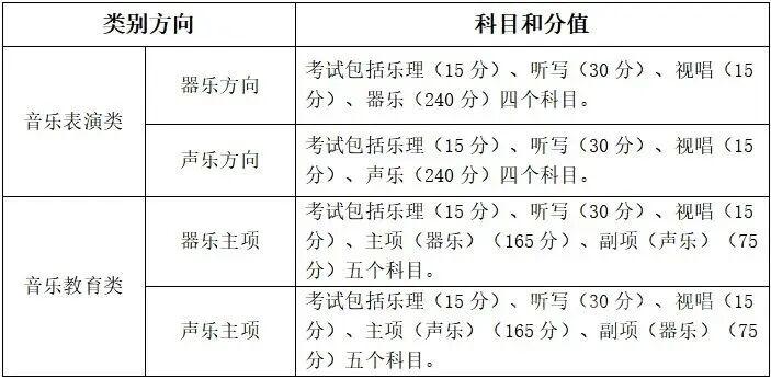 考试包括乐理、听写、视唱、器乐、声乐五个科目。总分为300分,不同类别的考试科目与分值如下: