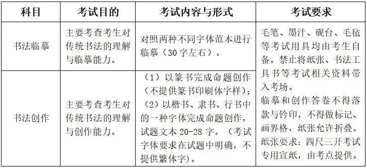 考试包括书法临摹、书法创作两个科目,每科150分,两科总分为300分。各科目考试时间如下: