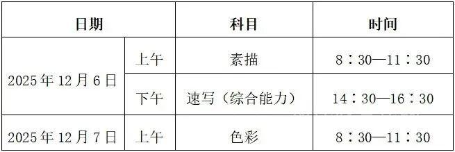 考试包括素描、色彩、速写(综合能力)三个科目,每科各100分,总分为300分。各科目考试内容、形式和要求如下: