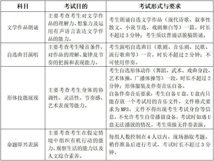 考试包括文学作品朗诵(100分)、自选曲目演唱(50分)、形体技能展现(50分)、命题即兴表演(100分)四个科目,总分为300分。