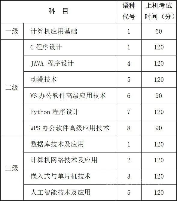 高校计算机等级考试分三个级别,所有级别科目均实行上机考试。考生可登录浙江省等级考试考生报名系统(https://crcs.zjzs.net)下载并打印准考证。具体考试时间以考生本人准考证上的时间为准,各级别的考试科目和时长如下: