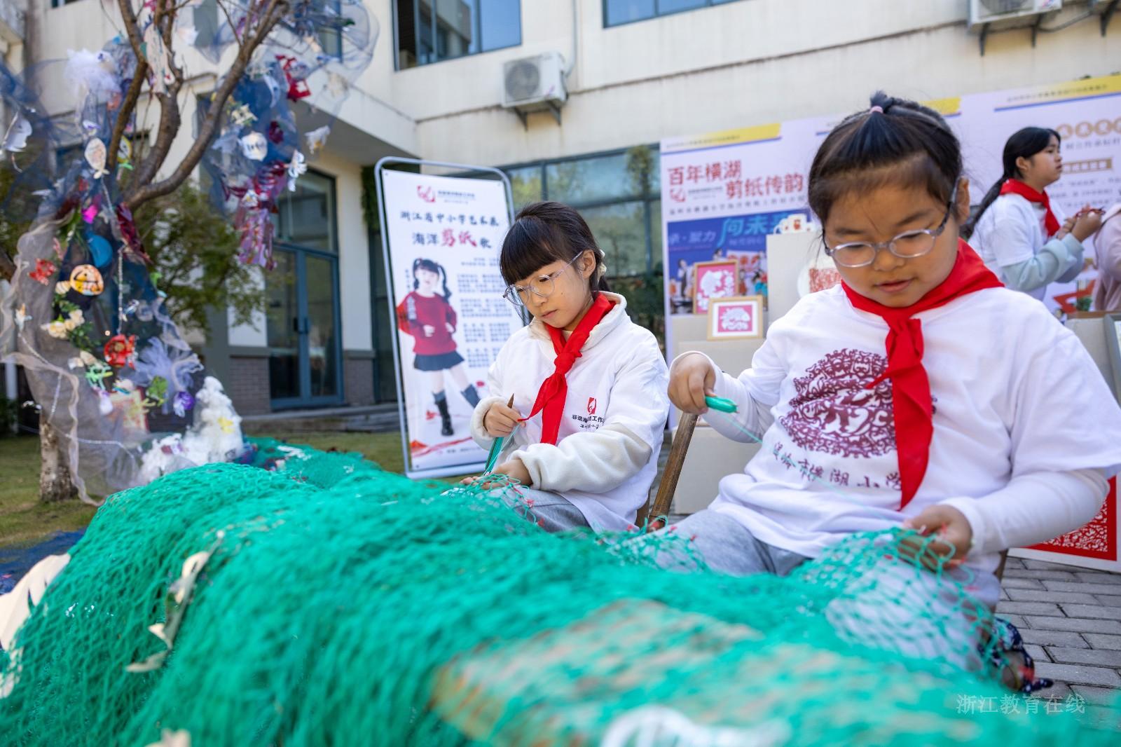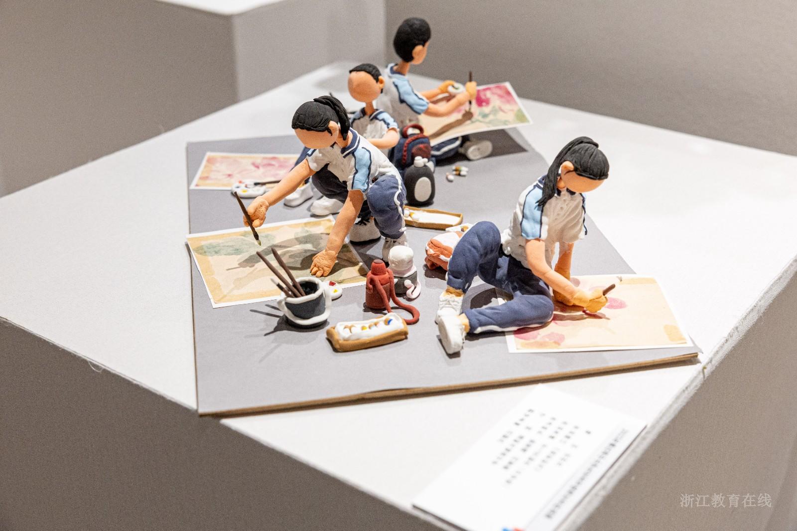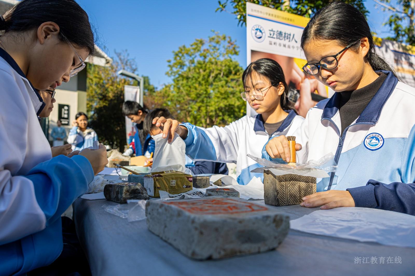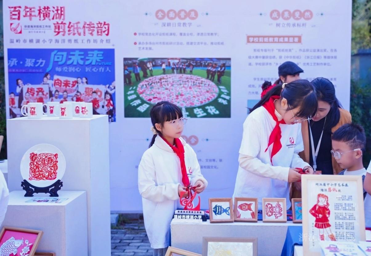开幕式现场,由温岭师生带来的美育体验工作坊吸引众多师生家长驻足体验,温岭市大溪四中的彩泥造型、城南中学的篆刻拓印、横湖小学的海洋剪纸、大溪小学的海角版画、五龙书院的版画文创,以及市联合艺校的民乐演奏等地方特色的互动项目,展现了全省中小学校推进“一校一品”“一校多品”艺术品牌工作成效。