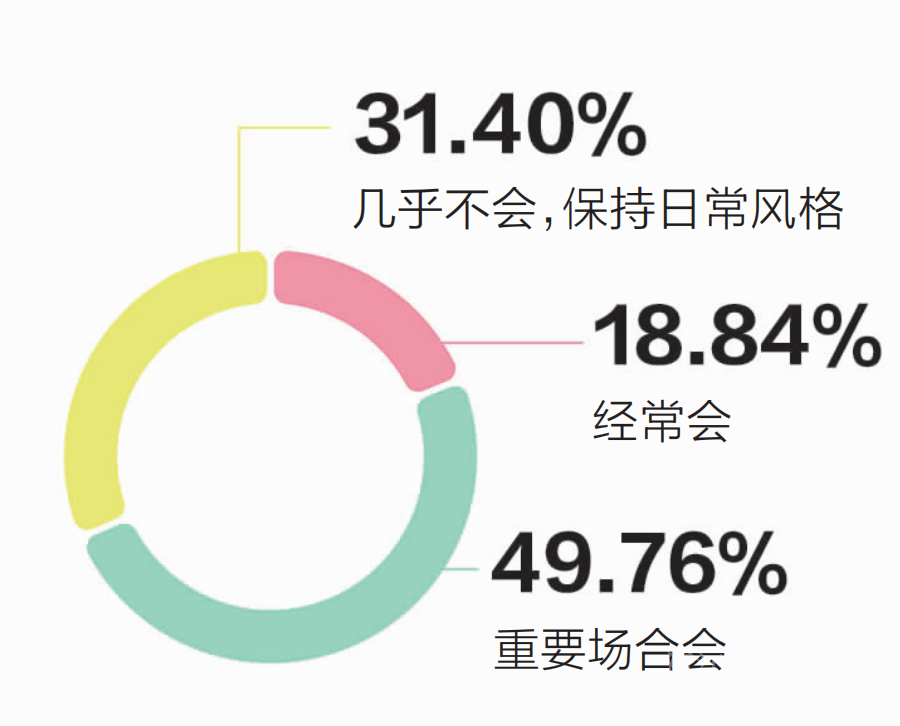 面对不同的场合,49.76%的同学会在重要场合特意改变穿搭风格,而31.40%的同学几乎不会,坚持日常风格。这种选择,是他们对“场合感”的理解,也是对自我风格的一种坚守。