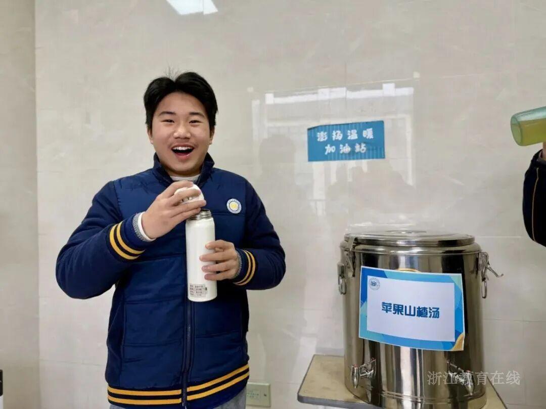 杭州市澎扬中学为师生准备了苹果山楂热饮,在寒冷天气中让他们感受到温暖与关怀。