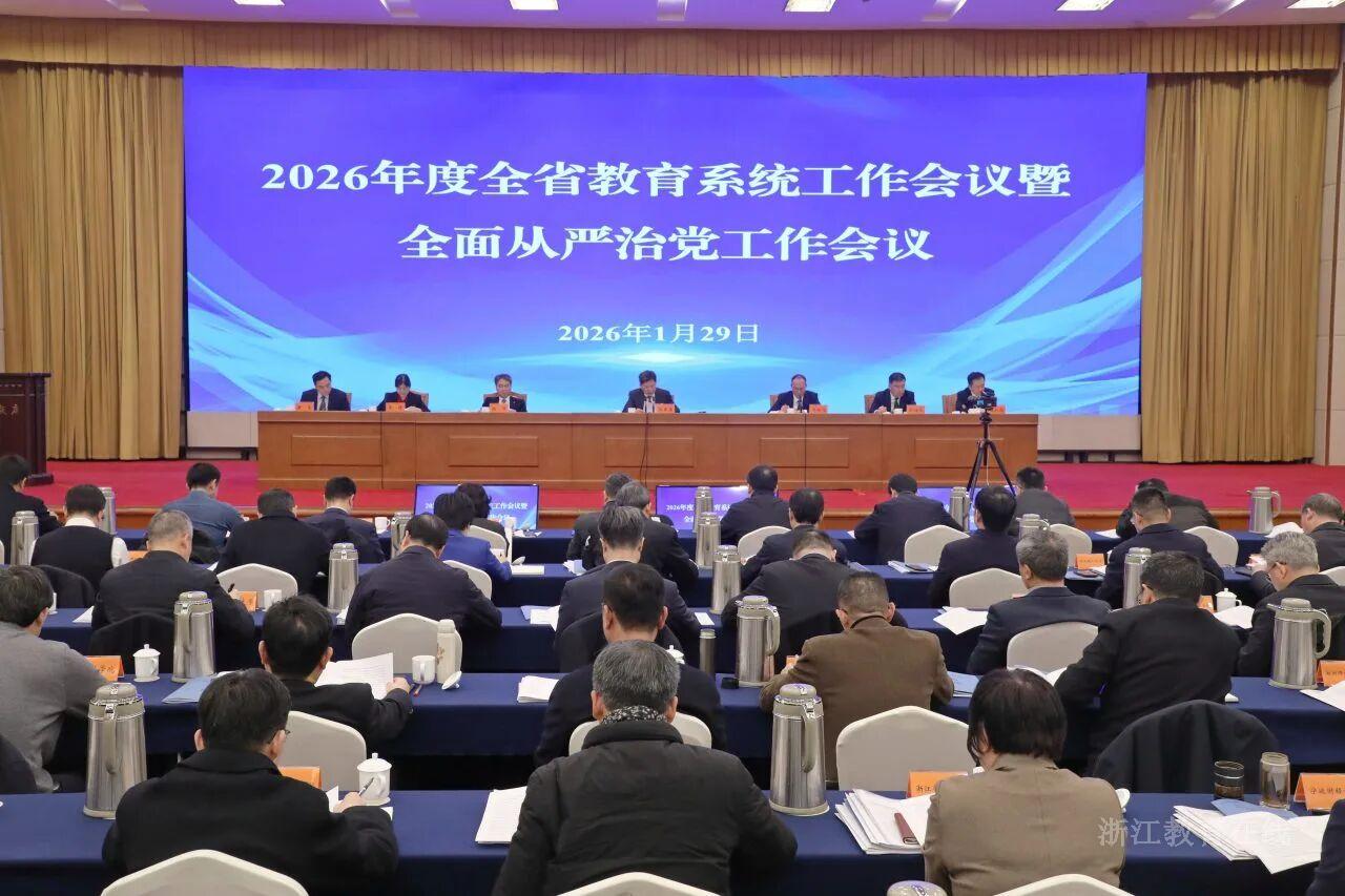 1月29日,2026年全省教育系统工作会议暨全面从严治党工作会议在杭州召开。会议认真贯彻落实习近平总书记关于教育的重要论述和考察浙江重要讲话精神,全面贯彻党的二十届四中全会、二十届中央纪委五次全会、全国教育工作会议和省委十五届七次全会、省委十五届八次全会、省纪委十五届五次全会、省两会精神,总结经验、分析形势,研究部署2026年重点工作,确保“十五五”高质量开局起步。