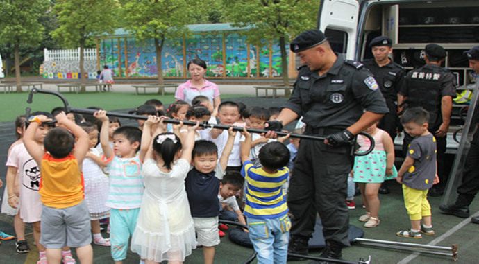在升旗仪式后,巡特警大队的队员们给孩子们展示了防暴恐演练、擒敌拳,讲解了PTU装备,传授安防技巧,与小朋友们交流互动。各班还组织开展了以“防拐骗”、“防溺水”等为主题的班会。在主题班会课上,警察、教师扮演不同角色,一起用生动具体的互动游戏让孩子们学会心肺复苏术,不跟陌生人走,不擅自下水游泳等知识,增强师生的防拐意识、防溺水急救技能。
