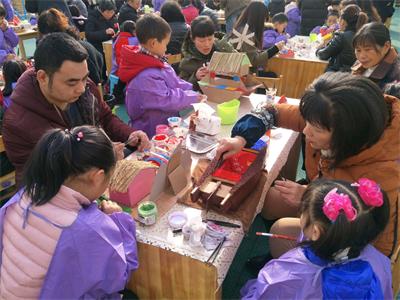 今天,最靓丽的风景线当属我们的家长和孩子,每一个家庭形成一个亲子小组,在“地方小镇”文化的牵引下,运用纸浆进行现场制作,整个现场都是浓浓的情谊和满满的爱意!有的家长以“蚕桑小镇”为主线,运用纸浆制作了蚕宝宝、桑叶等作品;有的家长以“下渚湖水乡”为主题,制作了水鸟、渔船等纸浆作品;还有的紧紧围绕“莫干山水”,用纸浆描绘出了栩栩如生的竹子、民宿等作品。值得一提的是,在场的每一件作品都是家长亲自构思和设计的,耳闻在场的一位家长说:“这个凉亭,花了我六个晚上的时间!”,感叹亲子们的作品!让我们看到了那么多优秀的作品,粗算一下便有几百件,竟无一件是重复的!每一件作品都是家长用心设计、巧妙制作的成果!