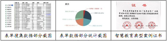 2019年3月,奉化区教育局与首都师范大学合作,开展了基于大数据分析的课堂教学能力提升工程(简称COP项目),学校成为唯一一所小学段试点学校,组建了语数英学科核心团队,每月定期开展相关培训活动和课堂教学观察分析。经过首师大博导和教授的指导,团队教师都能通过信息化手段记录相关课堂观察数据并进行大数据分析,有效提升教师的课堂教学能力。在日常研修工作中,学校倡导推广智能表单应用,大大节省了原来分发、回收、整理纸质文档和分析数据的时间,提高了日常研修的时效性。以“教师论文发表与获奖信息”搜集为例,在表单后台会自动生成大数据分析图表,为后续研修提供了客观的依据。学校还将表单应用成果进行了总结推广——《“表单应用+” 让教学更加智慧》案例被评为浙江省智慧教育典型案例。