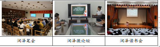 润泽笔会以“润慧泽思,笔耕会友”为主题,旨在提高教师的写作水平和教科研专业素养。微论坛重在为教师的研修搭设一个交流的平台。如学校第四期微论坛活动以“教学评价”为主题,采用“围绕同一主题,不同学科交流,现场随机点评”的方式进行,使论坛主题更加聚焦,学科特色更加鲜明,现场点评更加动态。同时,每次论坛都会在网络研修平台中开辟了线上交流,全体教师参与网络研讨,使论坛的研讨空间扩展到无限的网络交流中,研讨时间延展到日常实践与思考中,更大限度的发挥教育科研交流的质效。读书会则重在主题聊书、以书会友,通过阅读交流引发教与学的共鸣,或以同一本书为一个话题的形式展开交流;或以“朗读者”的形式进行朗读和推荐,交流自己的阅读故事和感受;或以专业论著为载体,共同畅谈阅读心得。