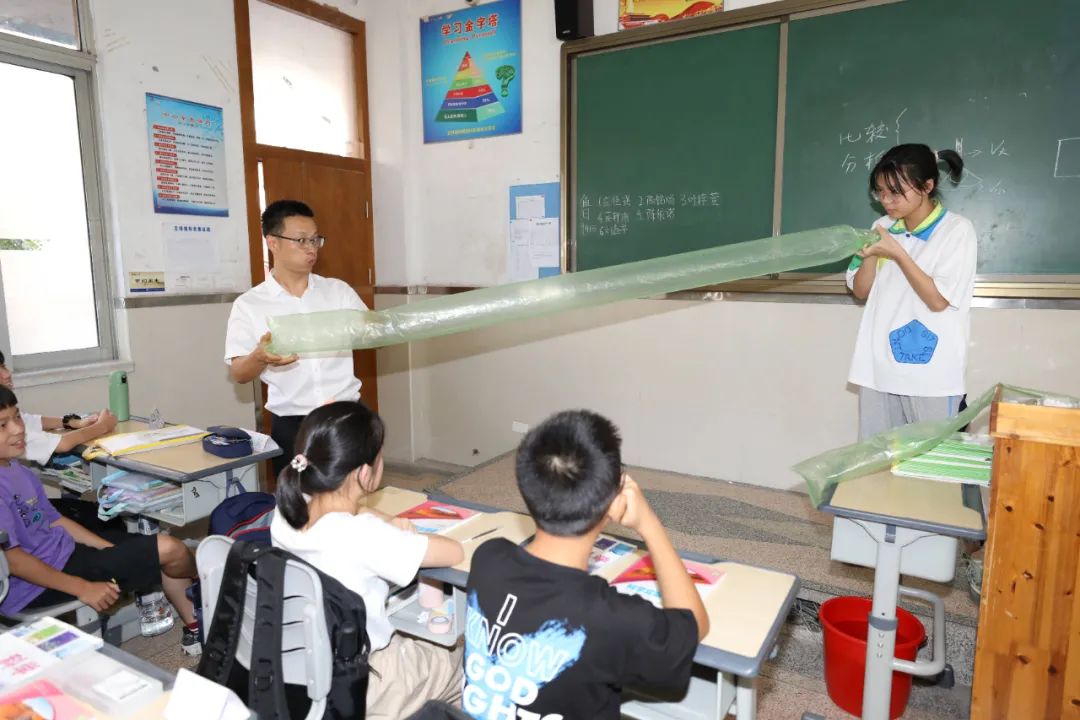下午4点,伴随着上课铃声,温州市瓯海区梧田第一中学科学老师潘欣带着一打长方形塑料袋走进教室。“上午我们讲了流速与压强的关系,现在我们开始游戏时间,看谁能把这条塑料袋吹起来!”经过几次失败后,学生们运用科学知识把袋口拿到离嘴巴20厘米处,迅速吹一口气,塑料袋果然迅速膨胀起来。