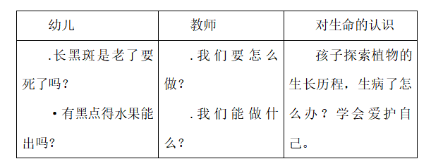 教师再次教研,进一步明晰了一些方向,考虑小组活动要更多地关注孩子内在的思维,建构认知和能力的过程,也分析到其实每种果蔬身上的黑点是不同的,有些黑点是果蔬的呼吸器官,就好像我们的口鼻一样,吸收新鲜的氧气,甚至还会排出二氧化碳。而有的黑点真的是一种病,石榴生尾孢霉菌,需要养护、治疗。